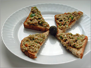 il composto e un filo di olio di oliva. Prova anche strofinando dell'aglio sulle fette di pane appena tostato! |