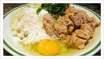 1 kg. di patate (Preferibili quelle a pasta gialla*. Contengono meno acqua!) - 300 gr. di tonno sott'olio - 2 uova - 2 cucchiai di parmigiano - 1 cucchiaio di pecorino - prezzemolo - 2 spicchi di aglio - sale - pepe.